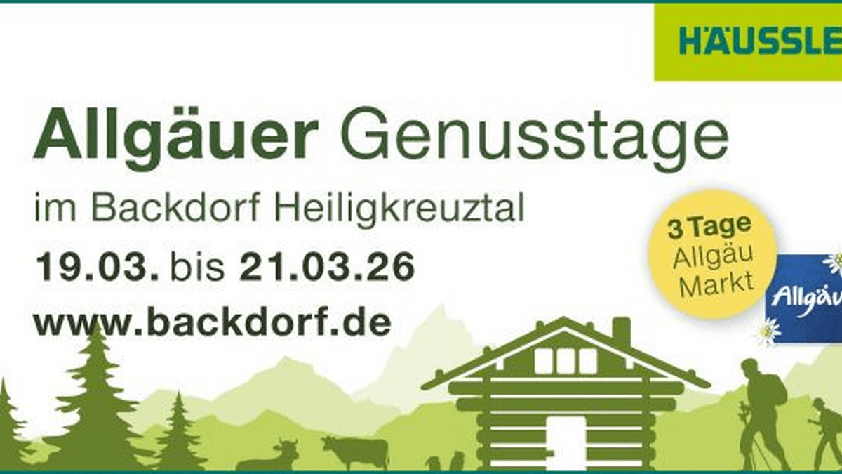 Das Allgäu zu Gast in Oberschwaben. Drei Tage lang ist das Allgäu zu Gast im Backdorf. Neben zahlreichen Vorführungen der Häussler Bäckermeister bringen verschiedene Aussteller das Allgäufeeling ins Backdorf: von der Sennerei, über Allgäuer Schinkenspezialitäten bis hin zum Schnapsbrenner. Der Eintritt ist frei!