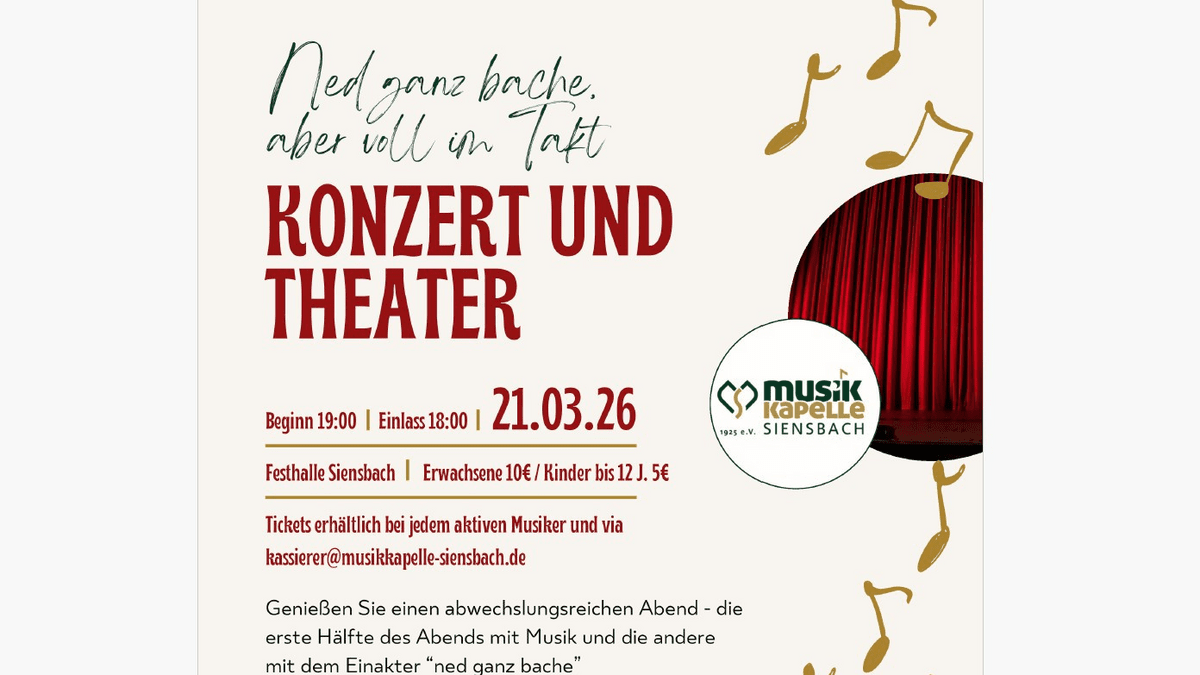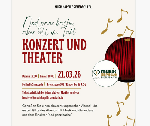 Konzert und Theater - es erwartet Sie ein abwechslungsreicher Abend. Die erste Hälfte des Abends lässt die Kapelle einige bekannte Melodien erklingen. Für die zweite Hälfte wird ein Einakter aufgeführt. In diesem Jahr steht nicht nur die Musik im Mittelpunkt. Eine kleine, engagierte Gruppe von Musikerinnen und Musikern hat sich erneut zusammengefunden, um Ihnen den Einakter „Ned ganz Bache“ zu präsentieren. Freuen Sie sich auf einen unterhaltsamen und entspannten Abend in der Festhalle Siensbach. Wir freuen uns sehr auf Ihr Kommen!