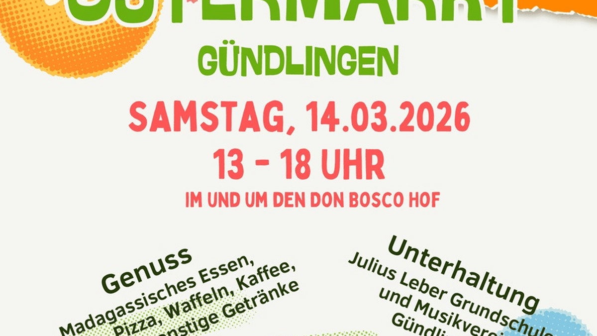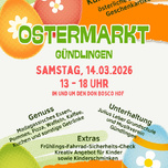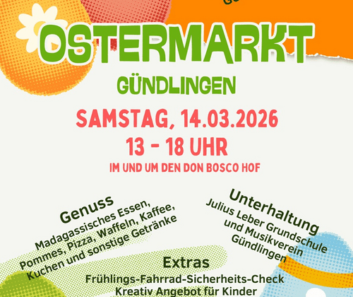 Der Bürger- und Kulturverein Gündlingen e.V. veranstaltet am Samstag, 14.03.2026 ab 13 Uhr im und um den Don Bosco Hof in Gündlingen, den Gündlinger Ostermarkt. 16 Kleinkunstaussteller präsentieren und verkaufen ihre selbstgefertigten Produkte. Für das leibliche Wohl sorgen der Bürger- und Kulturverein Gündlingen e.V. mit Kaffee, Kuchen und sonstigen Getränken, die Jugend-Feuerwehr Gündlingen mit Waffeln, die Julius-Leber Grundschule Gündlingen mit Pommes, der Deutsch Madagassischer Verein Esslingen e.V. (Vertreten durch Petra und Lorenz Hiss aus Gündlingen) mit madagassischem Essen und Marco Zünd mit Pizza. Zusätzliche Service-Stationen werden geboten: Fahrrad-Frühjahrs-Sicherheits-Check durch Hubert Wiedensohler, GS-Gündlingen Kreativ-Programm Kinder, (Sabrina Schätzle) Tanze ein Lächeln e.V. Kinderschminken die Julius-Leber Grundschule Gündlingen und der Musikverein Gündlingen e.V unterhalten die Gäste im Laufe des Nachmittags musikalisch.