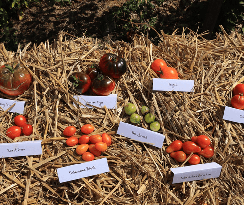 Die bunte Vielfalt der Tomaten kann in einer Tomatenausstellung mit seltenen, alten Sorten erlebt werden. Es gibt es mindestens eine Sorte je Buchstabe des Alphabets: Von A wie Alter Kommunist bis Z wie Zwergenwunder. Dazu gibt es Infos zu Sorten, Ernte & Verwendung und im „Tomatengarten“ hinter dem Haus können einige der Sorten live, in echt und in Farbe bewundert werden. Das passende Saatgut der neuen Lieblingssorte kann vor Ort erworben werden.