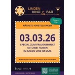 Filmhighlights zum Frauenmonat Zwei Überraschungsfilme die Bezug nehmen auf das Thema Frauen in der Musik , davon ein Biopic über eine Sängerin mit sehr langen schwarzen Haaren… Filminfos kommen! Nach den Filmen bleibt die Bar geöffnet und lädt euch ein, den Abend entspannt ausklingen zu lassen – ob Filmgespräche, lockere Runden oder einfach ein gemütlicher Austausch mit der Community.