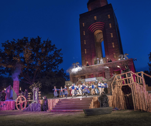 Auch in diesem Jahr erwartet die Besucher der Spreewälder Sagennacht ein musikalisches Openair-Spektakel über Geschichten bekannter sorbischer Sagenfiguren vor der imposanten Naturkulisse des Bismarckturms in Burg (Spreewald). Gehören die Sagen und Mythen wirklich nur in die alten, längst vergangenen Zeiten? In Burg, während der Spreewälder Sagennacht nehmen sie Jahr für Jahr, eindrucksvoll in Musik und Tanz gekleidet, zauberhaft Gestalt an. Aber … Was wäre, wenn es den Spreewald nicht mehr gäbe? Was würde mit den hier angesiedelten Märchen, Sagen und Mythen geschehen, wenn der Plan des Unternehmers Dieterich Muks aufginge? Der will nämlich den Spreewald einebnen, um hier eine riesengroße Fabrik zu errichten. Mit genau dieser Nachricht platzt der superreiche Muks in das freudige Müschener Erntedankfest. Die Menschen halten es anfangs für einen Scherz, müssen aber schnell erfahren, dass der böse Plan bitterer Ernst ist. Muks hat nicht nur das Geld, sondern auch den Oberpräsidenten der Provinz Brandenburg hinter sich. Von einer bewaffneten Eskorte begleitet, preist er den Menschen die Vorzüge seiner Mega-Fabrik an. Als sich die Menge dagegen auflehnt, kommt es zu Gewalt. Muks lässt keinen Zweifel daran, dass er seinen Plan mit aller Macht durchsetzen will. Für die Bewohner des Spreewalds scheint die Situation aussichtslos, wäre da nicht Wanka, die nicht zulassen will, dass ihre Heimat zerstört wird. Die junge Frau fasst einen verrückten Entschluss. Mutig setzt sie ihr Leben aufs Spiel, um die Pläne des eiskalten Herrn Muks zu durchkreuzen. Wie ihr dies gelingt, was sie am Hof des Wassermanns erlebt und warum der schüchterne Janek, der schon lange heimlich in sie verliebt ist, doch noch zu Wankas persönlichem Helden wird, sei an dieser Stelle noch nicht verraten. Natürlich können sich die Zuschauer wieder auf viele Sagengestalten, auf Schlangenkönigin und Schlangenkönig, auf Wasserfrau nebst Gatten und Tochter, auf alte und neue Lieder, auf buntes Treiben, tolle Musik und wunderbare Tänze freuen.