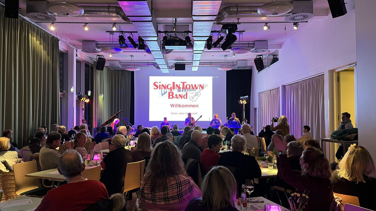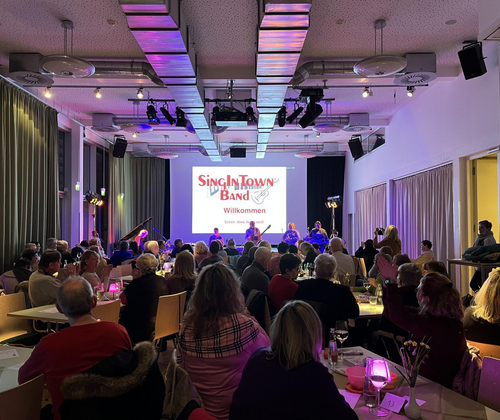 Die jeweiligen Songtexte werden mittels Beamer an eine Leinwand übertragen und schon kann es mit dem Singen losgehen. Die SingIn Town Band begleitet die Gäste durch den Abend. Hier gelten keine Normen und es gibt keine Voraussetzungen zum Singen, lediglich der Spaß am gemeinsamen Singen verschiedenster Musikstücke mit anderen zählt. Das vielfältige Repertoire lässt dabei keine Wünsche offen, so reicht es von Volksliedern über Schlager, bis hin zu Rock und Pop, so dass für jeden Geschmack etwas dabei ist. Für die Folgeveranstaltung dürfen die Teilnehmer ihre Wünsche auf einem Flipchart vermerken. Die Band bereitet die Wünsche dann für den nächsten Termin vor. Die gastronomische Versorgung erfolgt durch das Restaurant Velas im Neuen Rathaus.