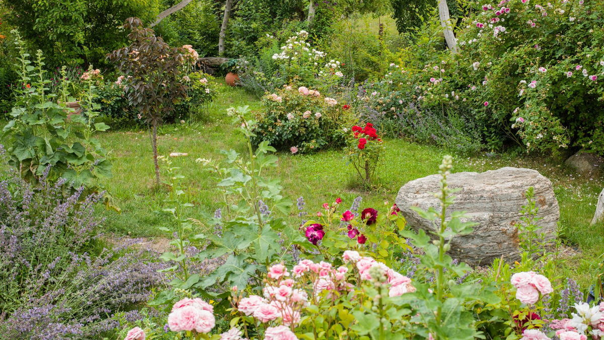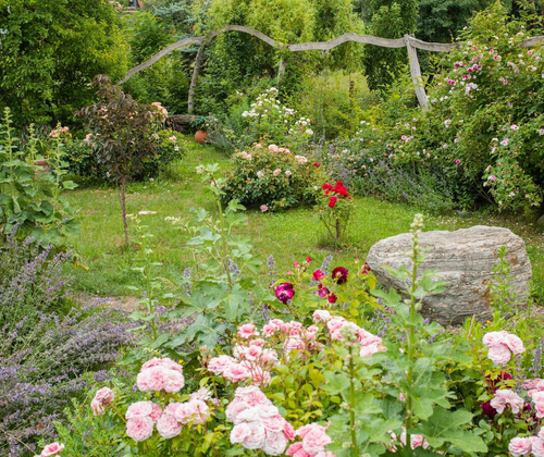 Parkähnlich angelegter Garten mit vielen, auch historischen Rosen, Pfingstrosen und zahlreichen weiteren Stauden. Liebevoll gestaltete Plätze laden zum Verweilen ein: unter alten Obstbäumen, an einem naturnah bepflanzten Teich mit zwei Bachläufen oder inmitten einer Robinienpergola mit Glyzinien. Zur Erfrischung bieten wir u.a. selbst hergestellte Wildkräutersmoothies, Säfte und herzhafte Snacks.