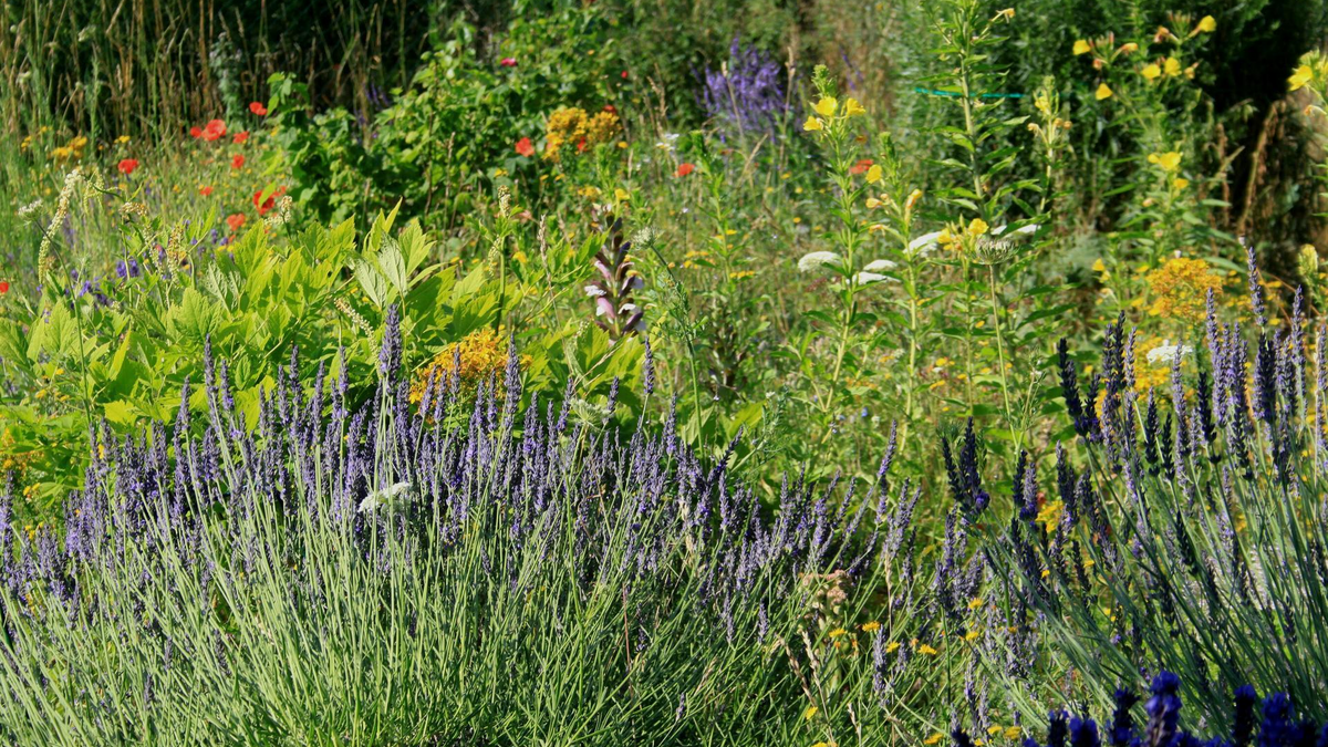 Knapp die Hälfte des ca. 5000 m² großen Grundstücks wird bewirtschaftet bzw. gärtnerisch genutzt. Ausgedehnte Bereiche bleiben sich selbst überlassen und werden max. einmal jährlich gemäht. Sie dienen als wertvolle Rückzugsorte für Vögel, Wildbienen und andere Wildtiere wie Igel und Ringelnattern. In die Wiesenbereiche werden Wege hineingemäht. Es gibt eine eigene Schilfkläranlage mit kleinem Teich – ein Biotop für Frösche und Libellen -, viele verschiedene, zum Teil alte Obstbäume sowie Beerensträucher. Eine Besonderheit sind unsere zwei Spargelbeete, in denen sich Wildblumen und -kräuter ansiedeln dürfen. Gemüse wird in Mischkultur überwiegend in Hochbeeten und zwei Gewächshäusern angebaut. Im Garten gibt es überall lauschige Sitzplätze.