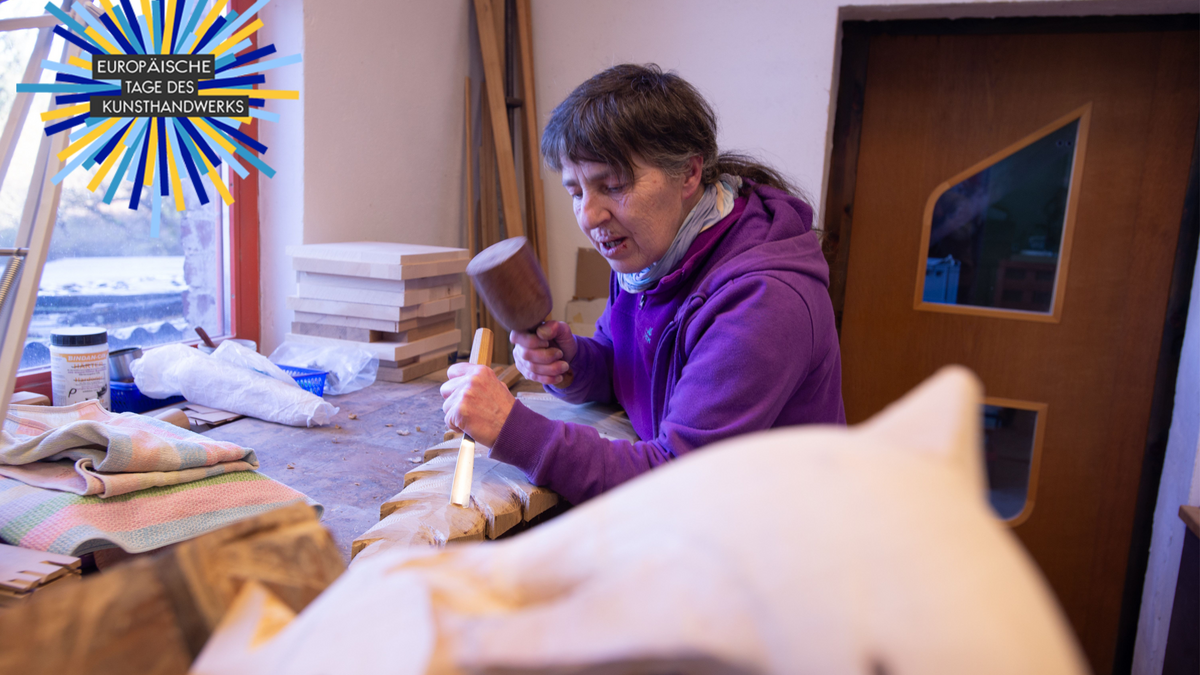 Die Künstlerin und Holzbearbeiterin Michaela Steidl stellt sich anlässlich der europäischen Kunsthandwerkstage vor und öffnet die Türe ihrer Werkstatt für die Besucher.