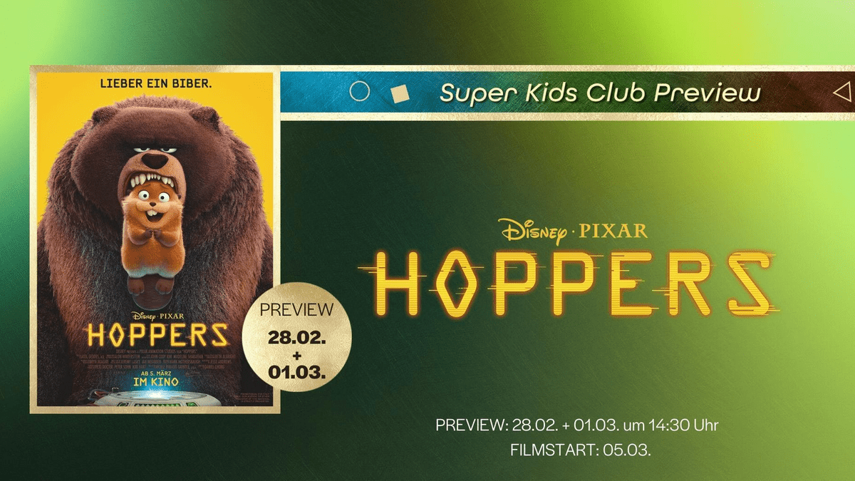 Was würdest du tun, wenn du mit Tieren sprechen könntest? In Disney Pixars HOPPERS hoppt Tierfreundin Mabel mithilfe neuester Technologie in einen Roboterbiber und macht die Tierwelt (un)sicher! Gemeinsam mit anderen Waldbewohnern macht sie sich auf, um ihren geliebten Teich vor Bürgermeister Jerry und seiner neuen Autobahn zu retten. Erlebt mit HOPPERS die Welt vor eurer Haustür auf eine Weise, die so viel aufregender und lustiger ist, als ihr es euch vorstellen könnt!