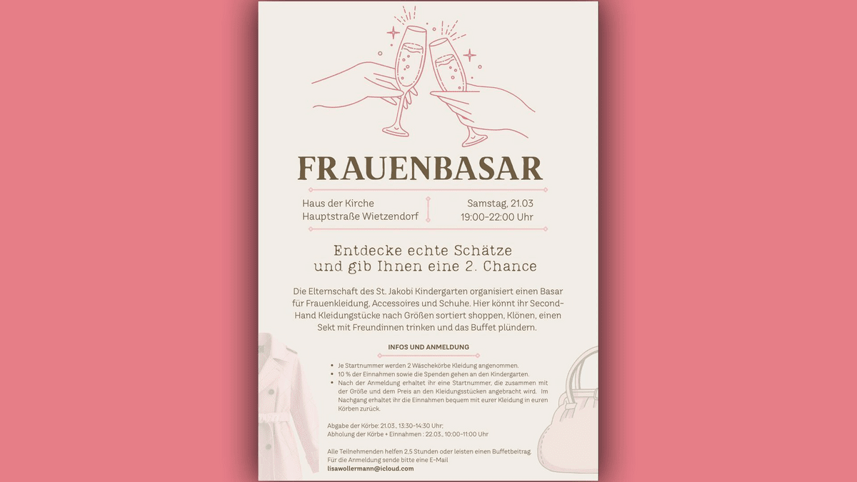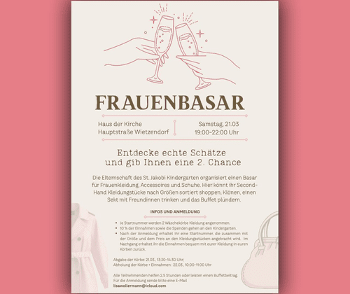 INFOS UND ANMELDUNG Je Startnummer werden 2 Waschekörbe Kleidung angenommen. 10% der Einnahmen sowie die Spenden gehen an den Kindergarten. Nach der Anmeldung erhaltet ihr eine Startnummer, die zusammen mit der Größe und dem Preis an den Kleidungsstücken angebracht wird. Im Nachgang erhaltet ihr die Einnahmen bequem mit eurer Kleidung in euren Körben zurück. Abgabe der Korbe: 21.03. 13:30-14:30 Uhr; Abholung der Körbe + Einnahmen : 22.03., 10:00-11:00 Uhr Alle Teilnehmenden helfen 2,5 Stunden oder leisten einen Buffetbeitrag Für die Anmeldung sende bitte eine E-Mail lisawollermann@icloud.com