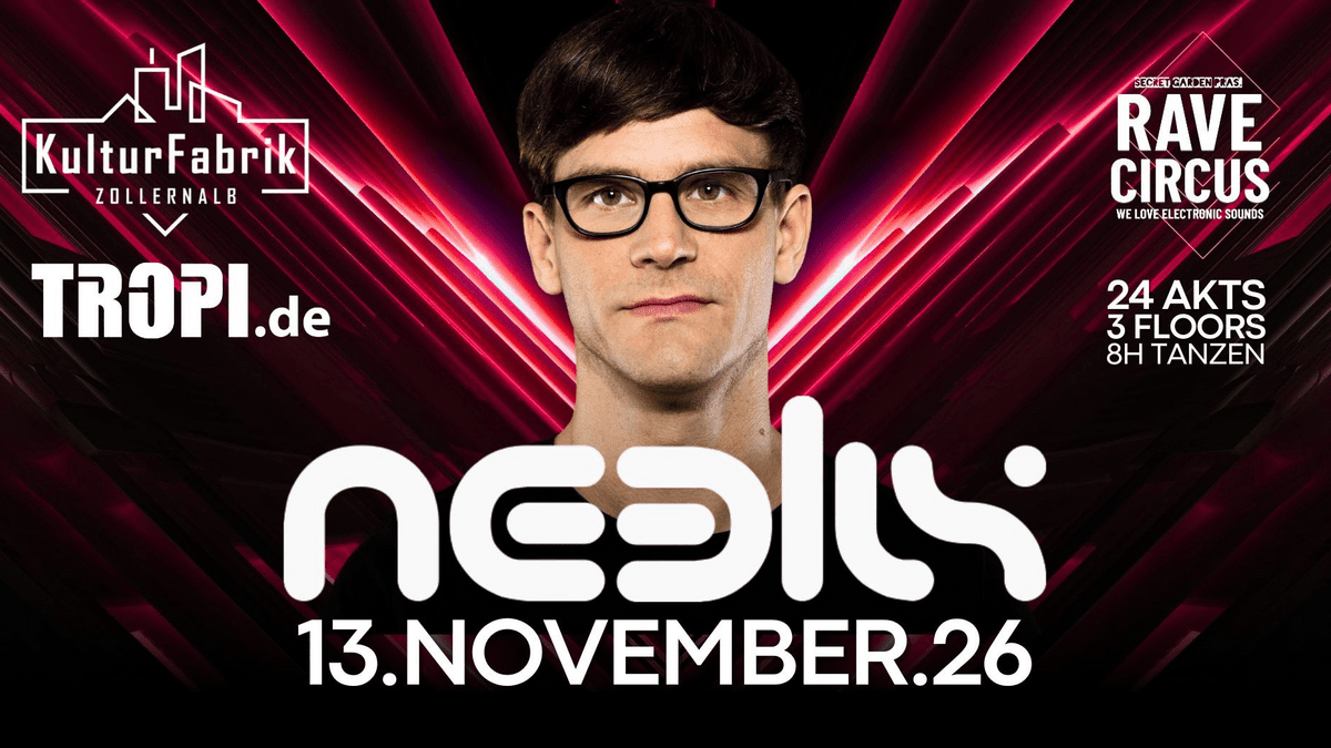 Die Sensation ist Perfekt. Neelix kommt wieder nach Albstadt! Der November wird heiß, am 13.11.2026 holt euch der Secret Garden NEELIX direkt von den größten Festivals der Welt in die Kulturfabrik nach Albstadt. Mit neuen Sounds und einer großartigen Performance wird Neelix den Secret Garden zum Beben bringen. Der Gig ist exklusiv, da es eine geringere Ticketanzahl auf Grund der Locationgröße geben wird. Einlass ab 16 Jahren mit Muttizettel über die APP Einlass 21 Uhr