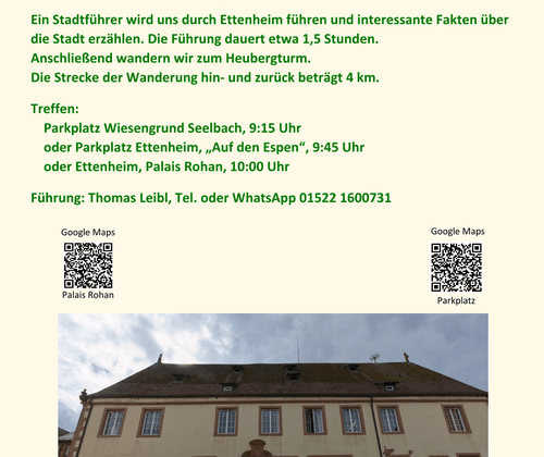 Ein Stadtführer wird uns durch Ettenheim führen und interessante Fakten über die Stadt erzählen. Die Führung dauert etwa 1,5 Stunden. Anschließend wandern wir zum Heubergturm. Die Strecke der Wanderung hin- und zurück beträgt 4 km. Ein Stadtführer wird uns durch Ettenheim führen und interessante Fakten über die Stadt erzählen. Die Führung dauert etwa 1,5 Stunden. Anschließend wandern wir zum Heubergturm. Die Strecke der Wanderung hin- und zurück beträgt 4 km.