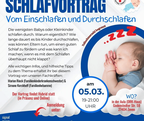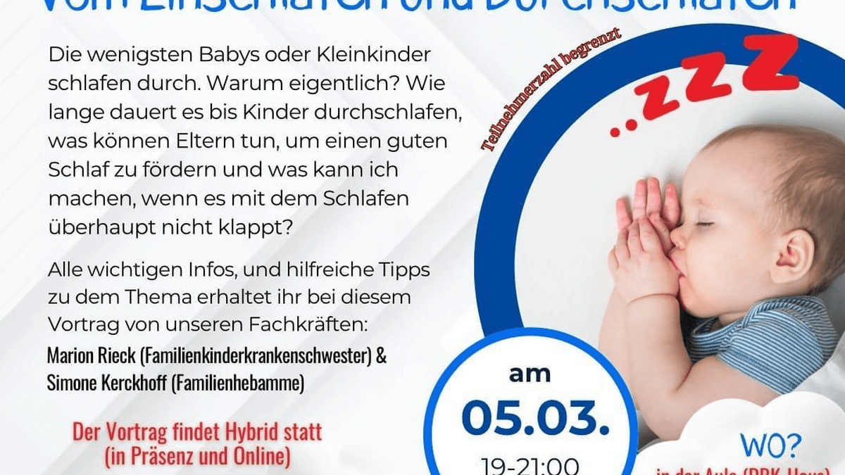 Die wenigsten Babys oder Kleinkinder oder Kleinkinder schlafen durch. Warum eigentlich? Wie lange dauert es bis Kinder durchschlafen, was können Eltern tun, um einen guten Schlaf zu fördern und was kann ich machen ,wenn es mit dem Schlafen überhaupt nicht klappt? Anmeldung unter: 0172-2837347 oder 04281-7171741 oder  Koordinierungsstelle@drk-bremervoerde.de