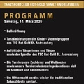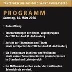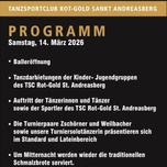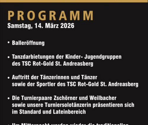 Programm: - Balleröffnung - Tanzdarbietungen der Kinder. und Jugendgruppen - Auftritt der Tänzerinnen und Tänzer sowie Sportler des TSC Rot-Gold - Die Turnierpaare Zschörner und Weilbacher sowie Turniersolotänzerin präsentieren sich im Standard und Lateinbereich Einlass ab 18:30 Uhr!