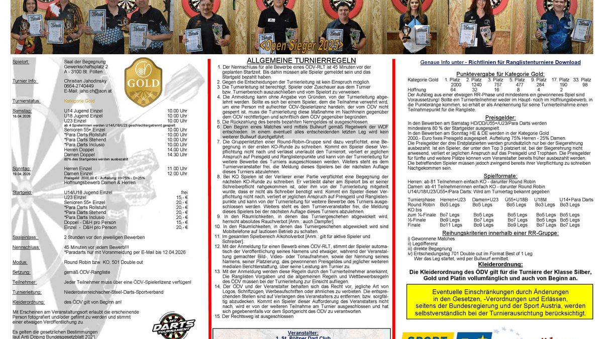 Steel Dart Turnier "Kategorie Gold", es dürfen nur Spieler mit gültiger ÖDV-Lizenz am Turnier teilnehmen.