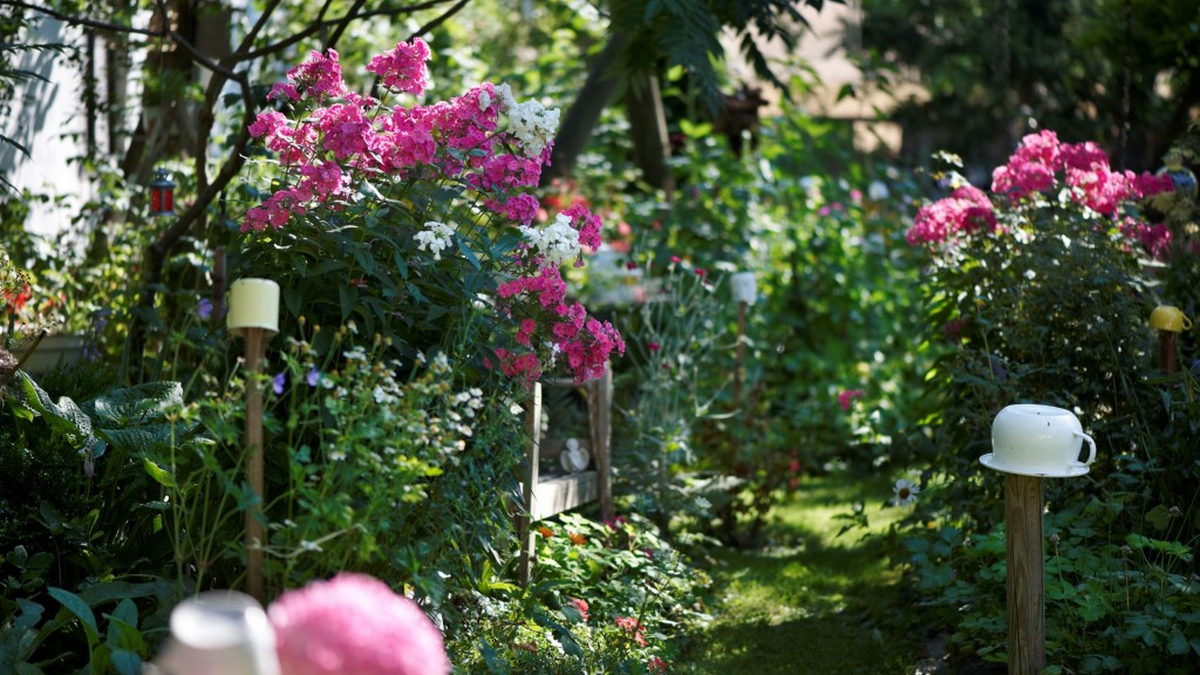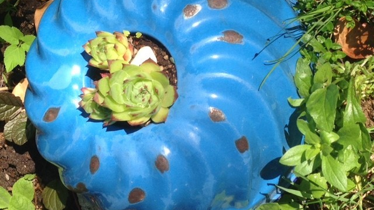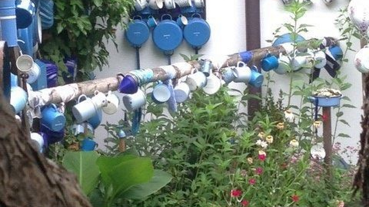 Schaugärtnerin Erika sammelt altes Emaillegeschirr und platziert dieses dekorativ im Garten, teilweise wird es bepflanzt oder mit Stroh gefüllt (als Insektenhotel) und in Szene gesetzt.
