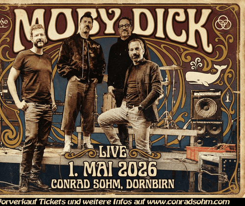 „Es gibt keine Beständigkeit auf dieser Erde außer dem Unbeständigen.“ (Herman Melville)Getreu diesem Leitmotiv kehrt Moby Dick am 1. Mai 2026 zurück, um im Dornbirner Conrad Sohm die Geister des klassischen Hardrocks zu beschwören.