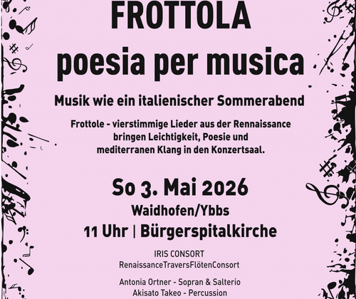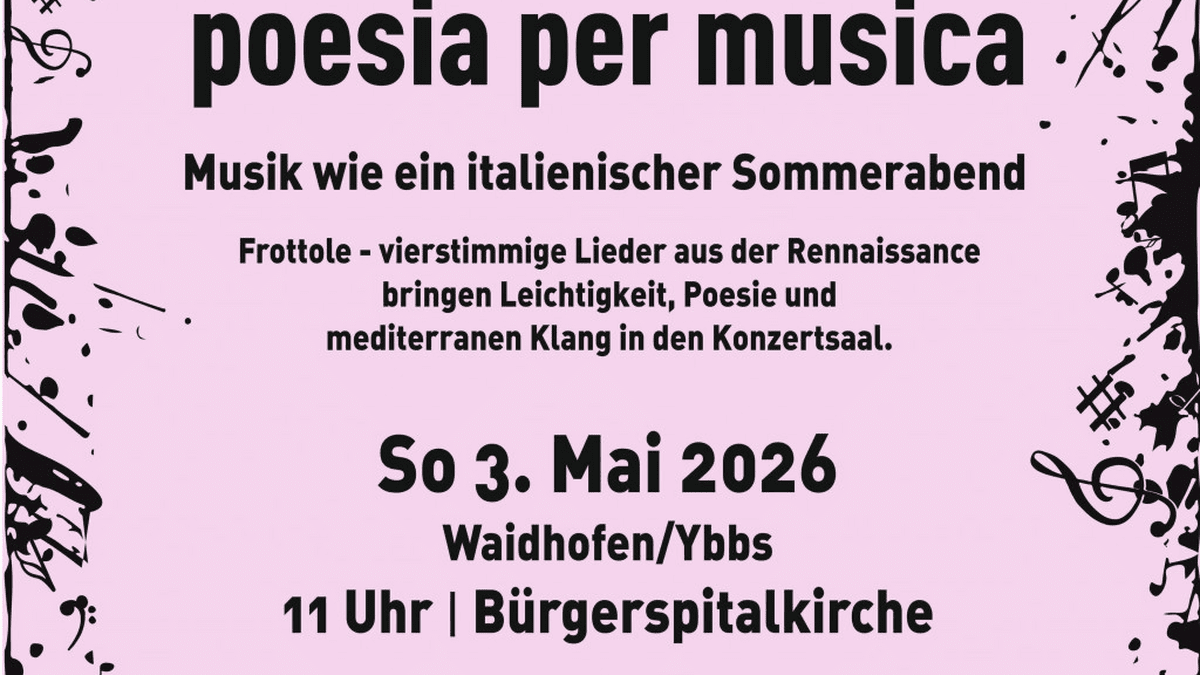 Den Auftakt bildet das Konzert „Frottola – poesia per musica“ am Sonntag, 3. Mai 2026 um 11 Uhr in der Bürgerspitalkirche Waidhofen/Ybbs.