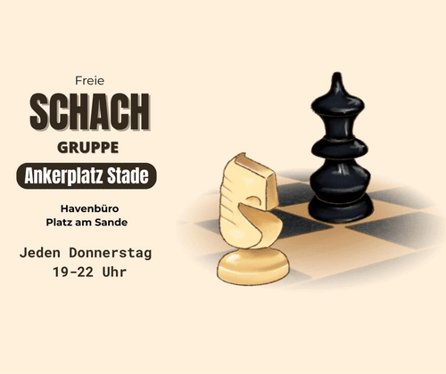 Schachmatt Kommt vorbei, denn der Ankerplatz Stade präsentiert: jeden Donnerstag Abend ein freies Schachspiel. Egal ob Profi oder Beginner, probiert euch einfach aus und kommt zusammen in der Schach-Gruppe.