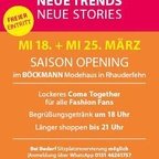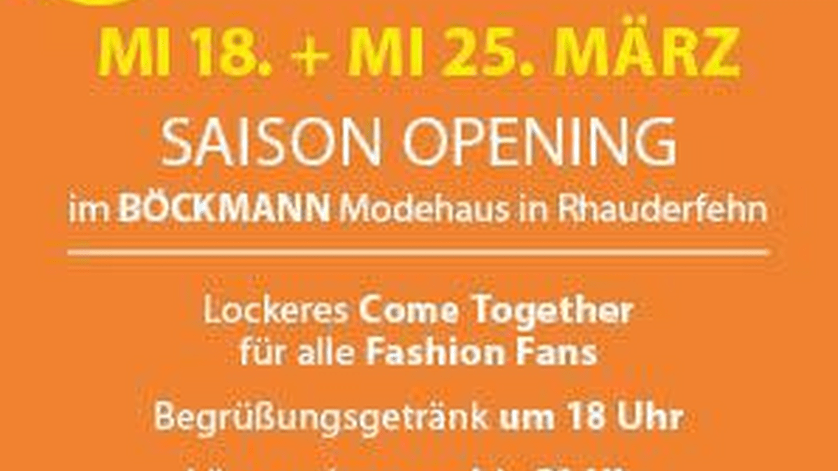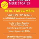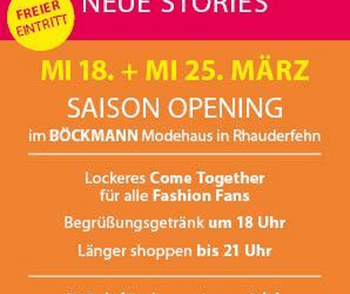 Trends Talk & Tratsch  Saison Opening im BÖCKMANN Modehaus – entdecke die neuen Modetrends!  Du liebst Mode und willst die neuen Fashion Trends der Saison so schnell wie möglich entdecken? Dann komm zum Saison Opening im BÖCKMANN Modehaus und erlebe einen entspannten Abend voller Inspiration, Stil und Shopping!  Freu Dich auf ein lockeres Come Together ab 18 Uhr inklusive Begrüßungsgetränk : Wir zeigen Dir die angesagtesten Farben, Schnitte, Materialien und Must-haves der neuen Saison.  Das Beste: Der Eintritt ist frei – und Du kannst an diesem Abend einfach länger shoppen , Dein neues Lieblingsoutfit finden und Dich professionell beraten lassen.