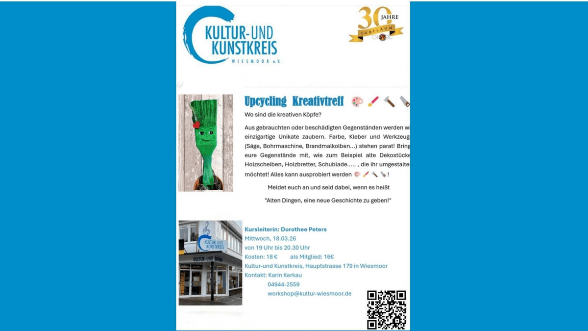 Aus gebrauchten oder beschädigten Gegenständen werden wir einzigartige Unikate zaubern. Farbe, Kleber, und Werkzeuge (Säge, Bohrmaschine, Brandmalkolben...) stehen parat! Bringt eure Gegenstände mit, wie zum Beispiel alte Dekostücke, Holzscheiben, Holzbretter, Schublade..., die ihr umgestalten möchtet! Alles kann ausprobiert werden! Meldet euch an und seid dabei, wenn es heißt "Alten Dingen, einen neue Geschichte zu geben!" Kursleiterin: Dorothee Peters Kosten: 18€, als Mitglied 16€ Kontakt: Karin Kerkau, 04944-2559, workshop@kultur-wiesmoor.de