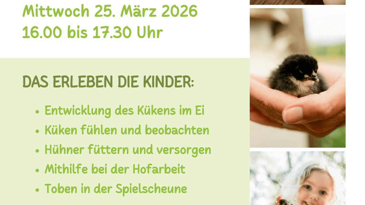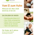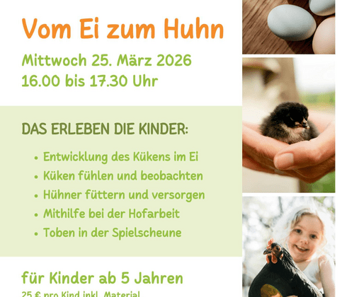 Das erleben die Kinder: Entwicklung des Kükens im Ei Kühen fühlen und beobachten Hühner füttern und versorgen Mithilfe bei der Hofarbeit Toben in der Spielscheune Für Kinder ab 5 Jahren. Anmeldung erforderlich unter bauernhof.mit.nancy@gmail.com oder telefonisch unter 0151 57412728.