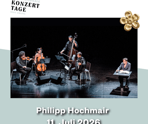 Am 11. Juli 2026 findet ein besonderer Höhepunkt im Stift Zwettl statt: Philipp Hochmair und die Österreichischen Salonisten mit dem „Hagestolz“ von A. Stifter und Musik von A. Bruckner! Und das direkt vor der Stiftskirche im Freien (bei Schlechtwetter in der Barocken Bibliothek)!