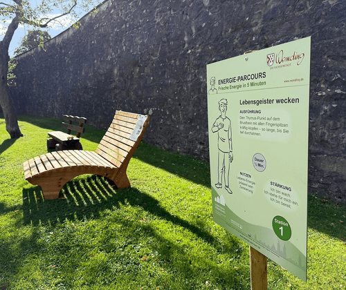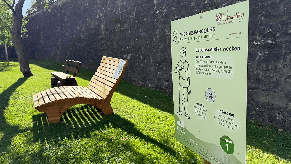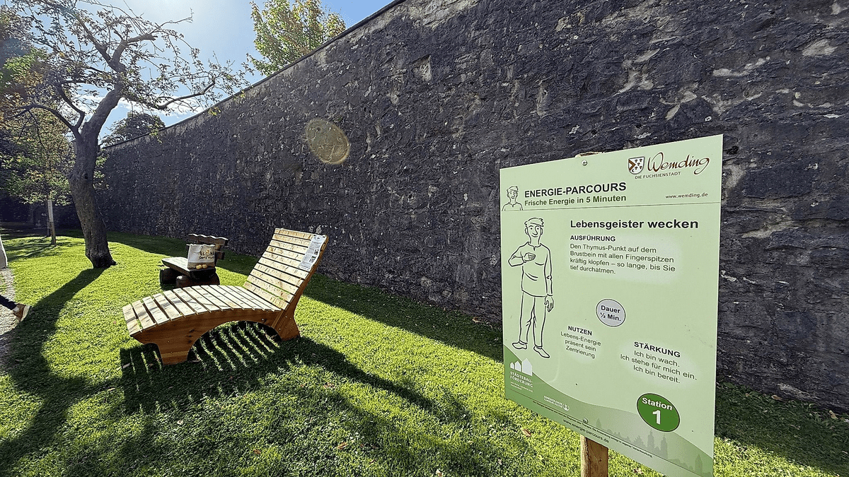 Der Energie-Parcours im historischen Stadtgraben Wemdings lässt sich mit einem Trimm-Dich-Pfad für Körper, Geist und Seele vergleichen: Während klassische Pfade die körperliche Fitness stärken, geht es hier um innere Balance. Er basiert auf acht einfachen neuro-energetischen Übungen, die innerhalb weniger Minuten durchgeführt werden können. Regelmäßig (i. d. R. erster Sonntag im Monat) bietet die Kinesiologin Carolin Mayer (Laub/Munningen) kostenlose Einweisungen an. Los geht's am Startpunkt in unmittelbarer Nähe zu einem Ginkgo-Baum, der für Vitalität und positive Energie steht.