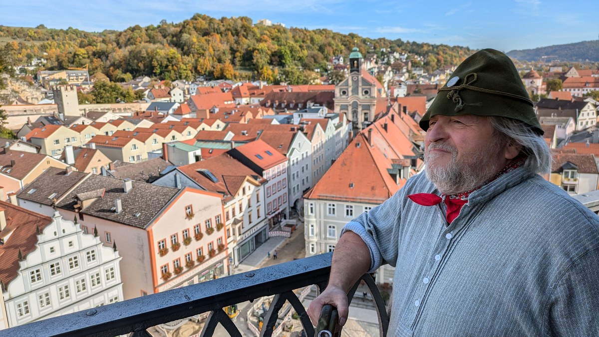 Im Rahmen dieser Kostümführung wandeln Sie auf den Spuren des historisch belegten Zinngießers und Turmwächters Anton Eisenhart. Dieser blickte im 19. Jahrhundert als einer der letzten Eichstätter Türmer hoch über der Stadt auf dem Rathausturm ins Weite, um die verantwortungsvolle Brandwache zu versehen. Dabei nahm er es mit seinem wichtigen Dienst auf dem zugigen Turm nicht immer allzu genau. Steigen Sie mit dem etwas raubeinigen und dennoch immer liebenswerten Türmer die engen Stufen bis zur Aussichtsplattform hinauf und tauchen Sie tief in die Geschichte des Eichstätter Türmerwesens ein, bevor Sie mit dem spektakulärsten Rundumblick, den die Altmühlstadt zu bieten hat, belohnt werden. Die Führung ist nicht barrierefrei. Der Aufstieg auf den Rathausturm erfolgt über zahlreiche Stufen (43 Stufen im Rathaus, im engen und steilen Turm sind es 129, also insgesamt 172 Stufen), sowie über einen engen und teilweise niedrigen Treppenaufgang. Die Stadt Eichstätt und die Turmführer übernehmen hierbei keine Haftung! Teilnahme ab 12 Jahren. Bei Sturm ist kein Besuch des Turmes möglich.