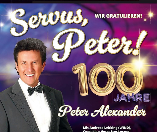 Jubiläums-Bühnenshow zum 100. Geburtstag von Peter Alexander. Nach dem überwältigenden Erfolg der musikalischen Komödie "Servus Peter", die über 260.000 Zuschauer begeisterte, bringt Entertainer Peter Grimberg nun eine neue Jubiläums-Bühnenshow auf die Bühne: "100 Jahre Peter Alexander – Wir gratulieren!". Diese besondere Produktion ehrt den unvergessenen Wiener Entertainer anlässlich seines 100. Geburtstags und verspricht ein unvergessliches Erlebnis für alle Fans. Peter Grimberg, geboren in Steyr, Oberösterreich, ist seit über zwei Jahrzehnten als Sänger und Entertainer auf internationalen Bühnen zuhause. Seine Leidenschaft für Musik entdeckte er bereits in jungen Jahren, inspiriert von Größen wie Elvis Presley und insbesondere Peter Alexander. Nach einer Ausbildung zum Kfz-Mechaniker folgte er seinem Herzen und gewann 1990 das "Goldene Mikrofon" in der Rudi-Carrell-Show, was den Grundstein für seine künstlerische Laufbahn legte. Eintritt 19,00 € - 26,00 € (mit gültiger BF Karte 3,00 € Ermäßigung)
