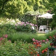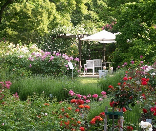 Insbesondere zur Hochblütezeit im Mai und Juni verwandelt sich der Rosengarten in ein wohlduftendes Blütenmeer. Außerdem lädt die direkt angrenzende Sonnenterrasse zum Verweilen, Entspannen und Staunen ein.