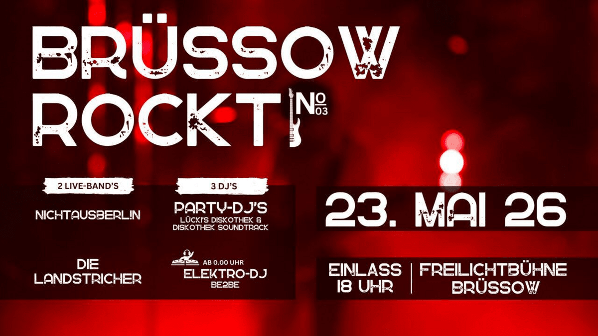 Nach dem Erfolg von 2024 und 2025 werden auch 2026 wieder zwei Livebands das Publikum mit guter, handgemachter Musik begeistern. Zwischendurch werden die Bands durch DJs unterstützt und ab 0 Uhr wird ein junger, talentierter Electro-DJ das Publikum weiter anheizen. Wie auch mit der Modernen Musik in Kirchen wollen wir auch mit Brüssow ROCKT! alle Menschen rund um Brüssow erreichen, von jung bis alt und gleichzeitig talentierten Musikern unserer Region eine Auftrittsmöglichkeit bieten. Wir haben uns 2024 erstmals die Veranstaltung Brüssow ROCKT! auf der Brüssower Freilichtbühne im Seepark ins Leben gerufen.