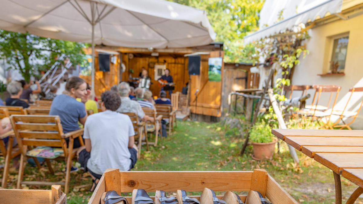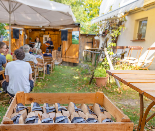 Familienkonzert: „Mit Fontane beim Vogelscheuchenball am Schwielow“ Das „Märkische Holzpantinen-Literatur-und-Musik-Theater im Grünen“ ist seit 34 Jahren Mittelpunkt in grünem Ambiente eines alten Obstzüchterhofs von Ferch, gelegen an der Südspitze des Schwielowsees. Die Bühne spielt seither erfolgreich und medienwirksam unter der künstlerischen Leitung von Liedermacher Wolfgang Protze (texts, comp., songs, guit., mod.) sowie seinen Musikern Winfried Rogel (keyb., voc.), Ingrid Protze (lyrics, rec., acc, voc.) und Gerald Bassing (sax., voc.). Seither entstanden zahlreiche Programme aus eigenen Liedern, Gedichten, Kabarettszenen und Geschichten. Sie sind landschaftlich sowie unterschiedlich lebens- und jahreszeitlich geprägt und stehen immer in Bezug zu Texten Theodor Fontanes. Das Publikum ist Bestandteil der Programme: Durch Zuhören und Mitsingen sowie durch das Rhythmusklappern mit den märkischen Holzpantinen an den Händen. Karten auf Vorbestellung!