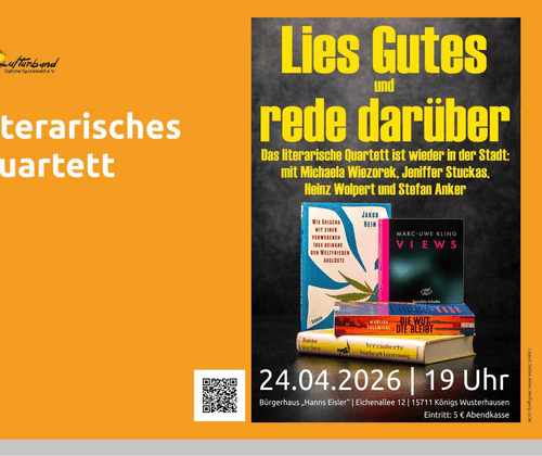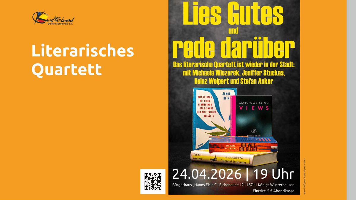 Alle vier Mitglieder des Quartetts haben alle vier Bücher gelesen, und jeder engagiert sich für einen der vier Titel ganz besonders. Michaela Wiezorek, Bürgermeisterin der Stadt Königs Wusterhausen, bringt den Bestseller „Views“ von Marc-Uwe Kling mit. Jeniffer Stuckas, stellvertretende Leiterin der Stadtbibliothek Königs Wusterhausen, tritt mit „Die Wut, die bleibt“ von Mareike Fallwickl an. Heinz Wolpert, Deutschlehrer im Ruhestand und Leiter des Literaturkreises Zeuthen, stellt Jonas Lüschers „Verzauberte Vorbestimmung“ in den Mittelpunkt. Stefan Anker, Fotograf aus Zernsdorf, hat Jakob Heins „Wie Grischa mit einer verwegenen Idee beinahe den Weltfrieden auslöste“ dabei und ist auch wieder Moderator der Veranstaltung.