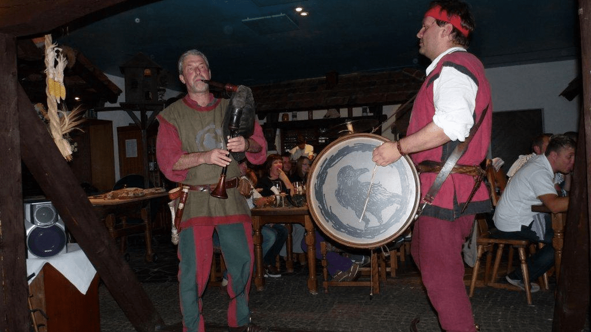 Lasset euch zurück versetzen in die Zeit der Ritter, Burgfroleins und legenderen Wikinger. Erlebet ein Programm mit dem Gaukler, Musik, Spiel und Stimmung, dazu ein großes Rittermahl: Edle Ritter und ehrenwerte Froleins!, eilet herbei dem Gesange und Tafelfreuden zu huldigen. Befreit Euch vom Plag mit Knecht und Magd um Euch zu laben mit Wollust beim Mal So der Mundschenk Euch erquickliches Met von ins Kuhhorn füllet Alsdann ziehet der Bäckermeister Laiber Bauernbrot frisch aus dem Steinofen, gewürzetes Fett von der Sau dazu Mutter Schulten rühret noch im Suppenkessel gewiegte Kräuter dazu. Sodann verspeiset lecker Süppchen vom Wurzelwerk Hernach man reichet Filet vom Salm auf südländische Art, mit Krebs aus dem Angergraben mit Tunke Keule vom der Sau unter der Kruste, Haxe vom Schwein und Hirsch, zartknusprige Hähnchenkeule, riesige Ritterspieße, feinstes Gartengemüs‘, Erdapfelauflauf und mehr Blauschimmelkäs' mit Trauben und Ananas Gebackener Zimtapfel in Rahm