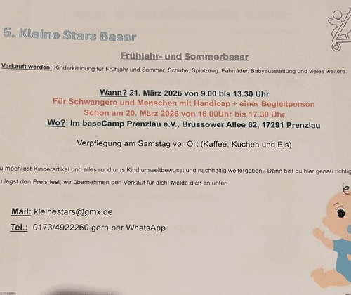 Umweltbewusst kaufen & verkaufen – alles rund ums Kind! 👶🌿 Du möchtest Baby- und Kinderartikel nachhaltig kaufen oder verkaufen? Dann bist du bei uns genau richtig! Verkaufen: Du legst deinen Preis fest – wir übernehmen den Verkauf für dich. Kaufen: Shoppen wie im Laden! Komm mit einer großen Tüte oder einem Korb vorbei und stöbere ganz entspannt, ohne Handeln und ohne zu wissen, von wem die Artikel sind. Exklusives Vorab-Shopping: Für Schwangere sowie Menschen mit Handicap inkl. Begleitperson 🗓  Nachhaltig, fair & stressfrei – wir freuen uns auf dich! ♻️💚    Email: kleinestars@gmx.de