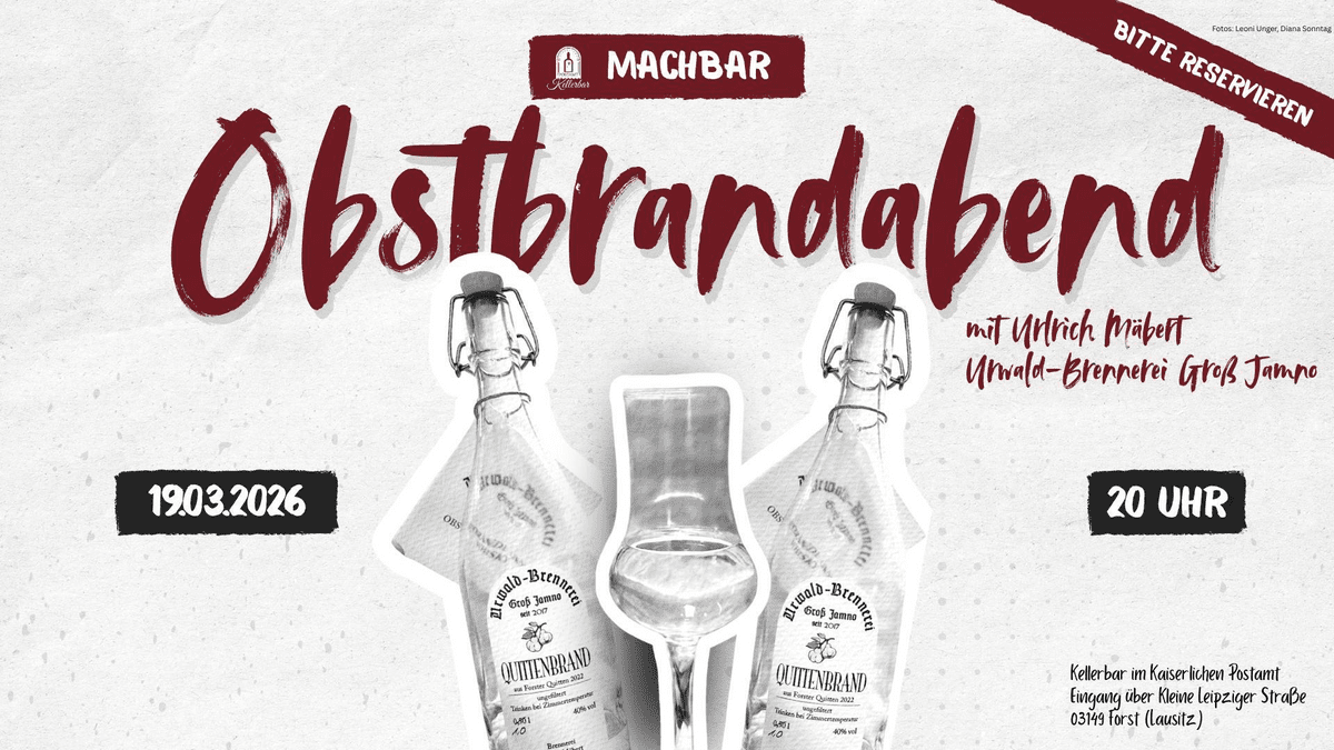 VON DER WIESE INS GLAS Heute dreht sich alles um das, was unsere Region ausmacht: Obstbäume, Handwerk, Geduld – und ehrlichen Geschmack. Zu Gast: Ulrich Mäbert von der Urwald-Brennerei Groß Jamno 2017 erfüllte sich Ulrich den Traum von der eigenen Brennerei – mitten im Forster Ortsteil Groß Jamno, nur wenige Schritte vom Urwald entfernt. Ein Ort, der nicht nur Namensgeber ist, sondern Haltung: regional, naturverbunden und mit Respekt vor dem Ursprung. Äpfel, Birnen, Pflaumen, Quitten und Kirschen aus der Umgebung werden vor Ort geerntet, gereinigt, gemaischt und vergoren – ganz ohne Zusätze. Der anschließende Brennvorgang erfolgt schonend, die Lagerung mit Zeit und Ruhe. So entstehen Obstbrände, die nicht laut sind, sondern klar – und das Aroma der Frucht sprechen lassen. In Zusammenarbeit mit dem Jerischker Winzer Hubert Marbach entstehen zudem jedes Jahr feine Traubenbrände aus regionalen Weintrauben. Riechen. Schmecken. Verstehen. Dieser Abend ist kein schneller Schnaps – sondern ein Austausch. Ulrich erzählt von seiner Arbeit, vom regionalen Kreislauf, von Insekten, Landschaft und warum Obstbäume mehr sind als nur Lieferanten für Alkohol. Ob Kenner oder Neugierige: Hier geht es ums bewusste Probieren, ums Fragenstellen – und um echte Handarbeit im Glas.