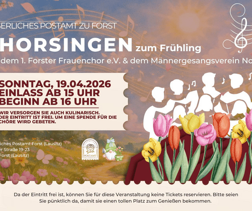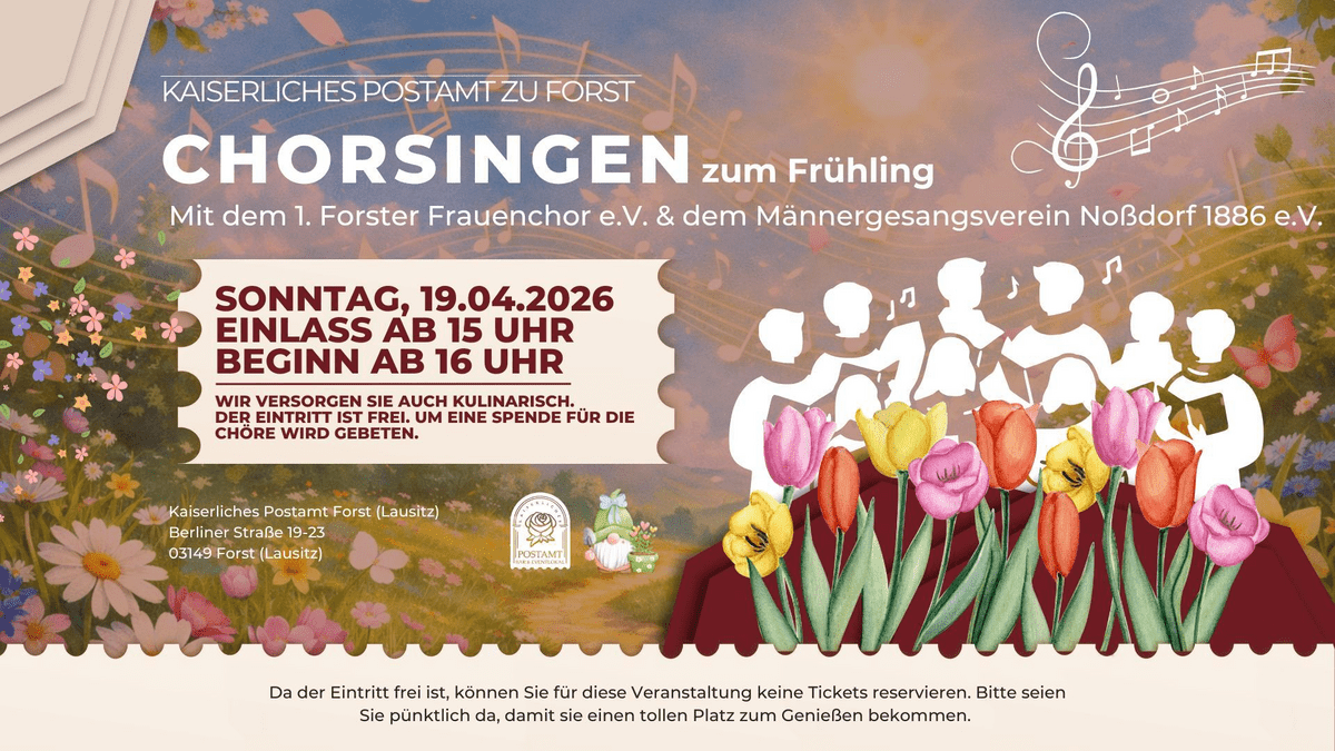 Wir begrüßen den 1. Forster Frauenchor e.V. und den Männergesangsverein Noßdorf 1886 e.V. ganz herzlich zu unserem Frühlingsliedersingen im Kaiserlichen Postamt Forst. Freuen Sie sich auf einen Nachmittag voller Musik, der den Frühling einläutet. Mit bekannten und stimmungsvollen Melodien, so erfrischend wie die ersten warmen Sonnenstrahlen und so belebend wie die aufblühende Natur, laden wir und die Chöre zum Genießen, Träumen und Mitsummen ein. Da der Eintritt frei ist, können Sie für diese Veranstaltung keine Tickets reservieren. Bitte seien Sie pünktlich da, damit sie einen tollen Platz zum Genießen bekommen. Um eine Spende für die Chöre wird gebeten.