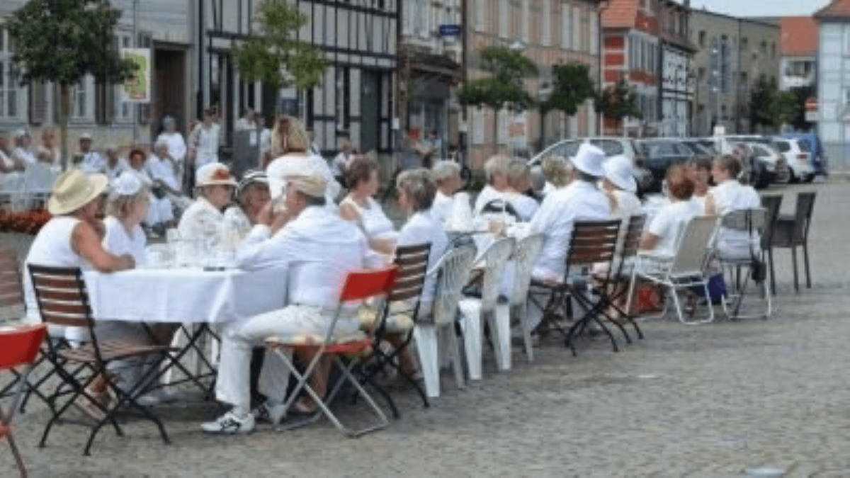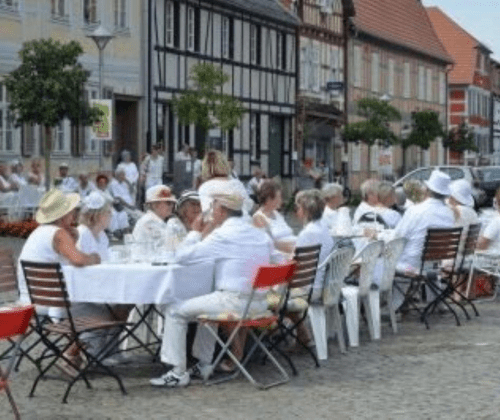 Das Dinner in Weiß ist sozusagen ein Massenpicknick weiß gekleideter Menschen, zu dem sich jeder Teilnehmer an selbst mitgebrachten Tischen zum mitgebrachten Essen hinsetzt - freuen wir uns auf ein Kultur-Gaudi! Mit Ehrung der Jubilare!   Mitzubringen: weiße Kleidung, Stühle, Tische, weiße Tischdecke, Geschirr, Essen und Getränke.   Wir kümmern uns um Musik, Überraschungen ...   Jeder ist willkommen! Ohne Anmeldung und kostenfrei!   Zusätzlich erhalten die Teilnehmer, die in diesem Jahr einen runden Geburtstag begingen oder begehen, eine kleine Überraschung. (Jubilare bitte anmelden bei Jacqeline Salih, Tel. 033979 559451)