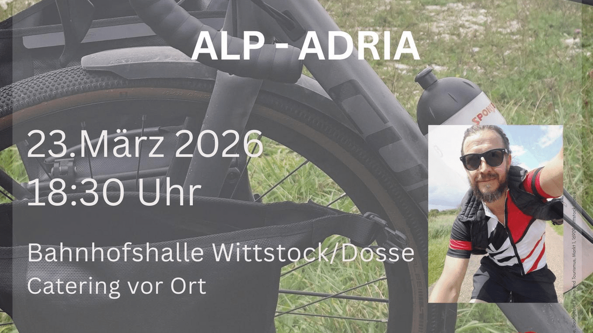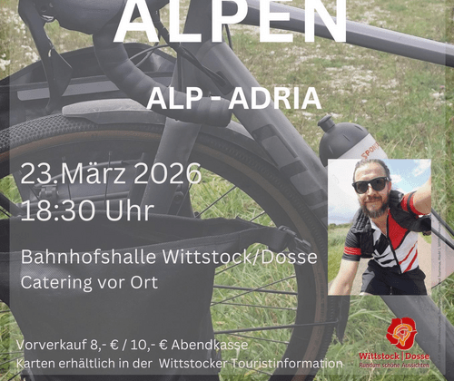 Diesmal berichtet er von den verschiedenen Radrouten die er durch - nicht über - die Alpen genommen hat, um von Deutschland ans Mittelmeer zu gelangen.  Das faszinierende an der Route sind die vielfältigen Landschaftsformen auf dieser relativ kurzen Distanz.  Er stellt Teile seiner Ausrüstung aus und gibt praktische Tipps, wenn man sich selbst auf die Reise begeben möchte. Es wird ein Catering vor Ort geben.   Kartenvorverkauf 8,- €/10,- € an der Abendkasse Karten sind in der Wittstocker Touristinformation erhältlich. Tel. 03394 429 550