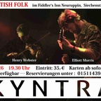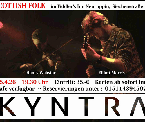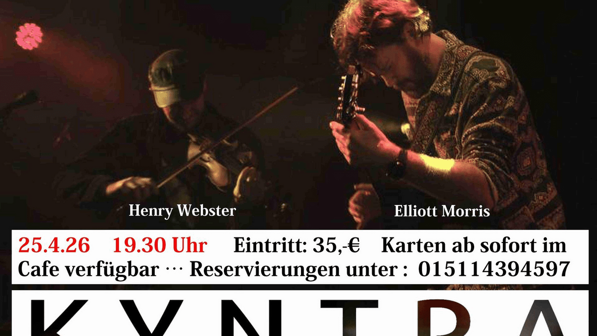 Die preisgekrönten Musiker Elliott Morris (Gitarre) und Henry Webster (Violine/Bratsche) bilden das Duo Kyntra und präsentieren raumgreifende, cineastische Kompositionen mit lebendigen traditionellen Wurzeln. Nachdenkliche Melodien münden in mitreißende Rhythmen und schaffen so eine faszinierende Balance zwischen Ruhe und Intensität. Kyntra traten bereits auf zahlreichen Festivals wie Petworth und How The Light Gets In auf, spielten als Headliner in Deutschland und tourten durch Großbritannien. Sie waren außerdem Vorgruppe für bekannte Folk-Größen wie Talisk und Project Smok. Ihr Debütalbum „As It Is Now, As It Was Then“, das am 30. Januar 2026 erscheint, fängt die Energie und Atmosphäre ihrer gefeierten Live-Auftritte perfekt ein.