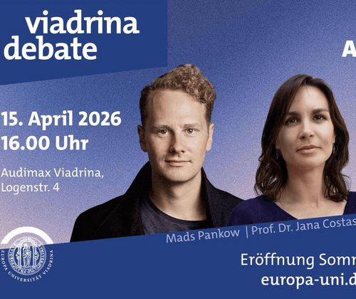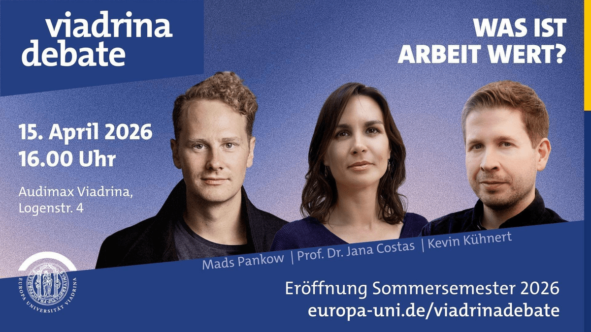 Zur Eröffnung des Sommersemesters 2026 lädt die Universität alle Interessierten zur Viadrina Debate und zur Eröffnung des Viadrina Coworking Space ein. Zu Gast ist Kevin Kühnert, live vor Ort im Gespräch mit Viadrina-Wirtschaftswissenschaftlerin Prof. Dr. Jana Costas. Thema dieser zweiten Ausgabe der Viadrina Debate ist „Was ist Arbeit wert? Zwischen Plattformökonomie, Finanzmärkten und gesellschaftlichen Umbrüchen“. Diskutieren Sie gemeinsam mit Expert innen und Studierenden, wie Digitalisierung und Finanzmärkte Arbeit verändern, warum klassische Vorstellungen von Sicherheit und Aufstieg brüchig werden und wie Arbeit und Wirtschaft in Zukunft neu gedacht werden können. Publizist und Politikberater Mads Pankow moderiert die Debatte. Die Veranstaltung findet in deutscher Sprache statt und wird simultan ins Englische gedolmetscht. Ab 17.30 Uhr schließt sich die feierliche Eröffnung des Viadrina Coworking Space an. Wir laden zum Austausch bei einem Getränk sowie zur Besichtigung der neuen Räumlichkeiten ein. Programm und Anmeldung unter www.europa-uni.de/viadrinadebate