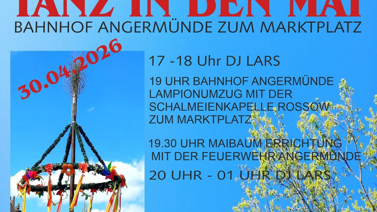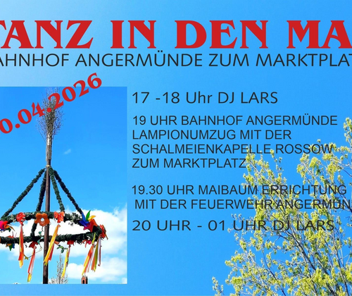 Am 30. April feiern Einheimische und Gäste gemeinsam den Start des Frühlings und des Wonnemonats Mai mit einem abwechslungsreichen Fest am Marktplatz. Begrüßt den Wonnemonat Mai mit einem ausgelassenen Fest im Herzen von Angermünde! Das traditionelle „Tanz in den Mai“-Event ist ein fester Bestandteil im Kalender der Stadt und zieht sowohl Einheimische als auch Gäste aus der Umgebung an. Programmablauf: 17:00 bis 18:00 Uhr: Eröffnung des Biergartens auf dem Kleinen Markt mit DJ Lars 19:00 Uhr: Start des Lampionumzuges am Angermünder Bahnhof mit der Schalmeienkapelle Rossow Route: Vom Bahnhof über die Berliner Straße und Fischerstraße bis zum Hohen Steinweg und zurück zum kleinen Markt. Anschluss: Aufrichten des Maibaumes durch die Freiwillige Feuerwehr Angermünde, begleitet von der Schalmeienkapelle und anschließender Tanzbeginn. 20:00 - 01:00 Uhr: DJ Lars sorgt für beste Tanz- und Festlaune. Lampionumzug: Erlebt einen festlich erleuchteten Zug durch die malerischen Straßen der Stadt. Maibaumaufstellen: Ein traditioneller Brauch, der von der Freiwilligen Feuerwehr mit viel Geschick durchgeführt wird. Geselliges Beisammensein: Der Abend bietet perfekte Gelegenheit, in geselliger Runde den Beginn des Mais zu feiern. Für Familien und Freunde: Kinder und Erwachsene sind gleichermaßen eingeladen, an diesem volkstümlichen Fest teilzunehmen. Bringt Laternen und gute Laune mit und lasst uns gemeinsam in den Mai tanzen!