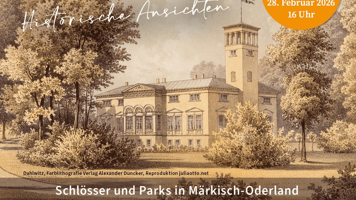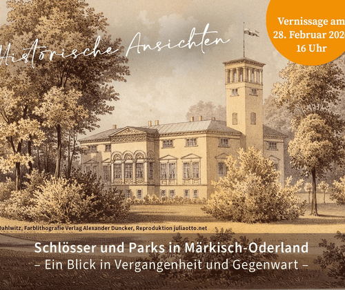Die Ausstellung erkundet den Kulturlandschaftsraum zwischen der östlichen Berliner Stadtgrenze und der Oder. Historische und zeitgenössische Ansichten von Schlössern, Gutshäusern und Parkanlagen ergänzt durch seltene Landkarten aus Privatsammlung zeichnen ein facettenreiches Bild der Region Märkisch-Oderland. Im Mittelpunkt stehen ausgewählte Lithografien und Grafiken des bedeutenden Verlegers Alexander Duncker (1813–1897), die Schlösser und Herrenhäuser des 19. Jahrhunderts in ihre parkgestaltete Umgebung eingebettet zeigen. Anhand erläuternder Texte wird ihre historische Entwicklung nachvollziehbar gemacht. Eine Einführung widmet sich exemplarisch der Entstehung und Transformation der Parklandschaften in Altlandsberg und Bad Freienwalde. Ein besonderer Höhepunkt ist eine großformatige Übersichtskarte des Landkreises, die rund 60 noch heute existierende Anwesen und Landschaftsparks verzeichnet. Sie versteht sich als Wegweiser für eigene Erkundungen und macht zugleich auf den unterschiedlichen Erhaltungszustand der Anlagen aufmerksam – einschließlich ihres hohen ökologischen Wertes, selbst dort, wo Parks als „verwildert“ erscheinen. Die Ausstellung ist vom  1. März bis 25. Mai 2026  in der  „Galerie in der Orangerie“ auf dem Schlossgut Altlandsberg  zu sehen. Öffnungszeiten:  Samstag & Sonntag, 13–17 Uhr Mit freundlicher Unterstützung der Sparkasse Märkisch-Oderland