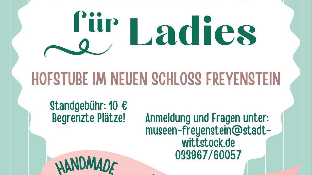 Am  28. März 2026  findet von 17:00-21:00 Uhr ein  Flohmarkt von Frauen für Frauen  in der  Hofstube des Neuen Schlosses Freyenstein  statt. In gemütlicher Atmosphäre kann gestöbert, gefeilscht und entdeckt werden – begleitet von einem liebevoll gestalteten  Büfett sowie Getränken . Wichtige Informationen für Ausstellerinnen: Die  Plätze für Stände sind begrenzt Kleiderständer müssen selbst mitgebracht werden 15 Tische können gestellt werden;  bei mitgebrachten Tischen folgende Maße beachten: L = 160 cm x B = 80 cm Ob Kleidung, Accessoires, Selbstgemachtes, Vintage, Antikes oder kleine Schätze – dieser Flohmarkt bietet Raum für Austausch, Nachhaltigkeit und Gemeinschaft unter Frauen. Also schnell anmelden – die Plätze sind begrenzt!