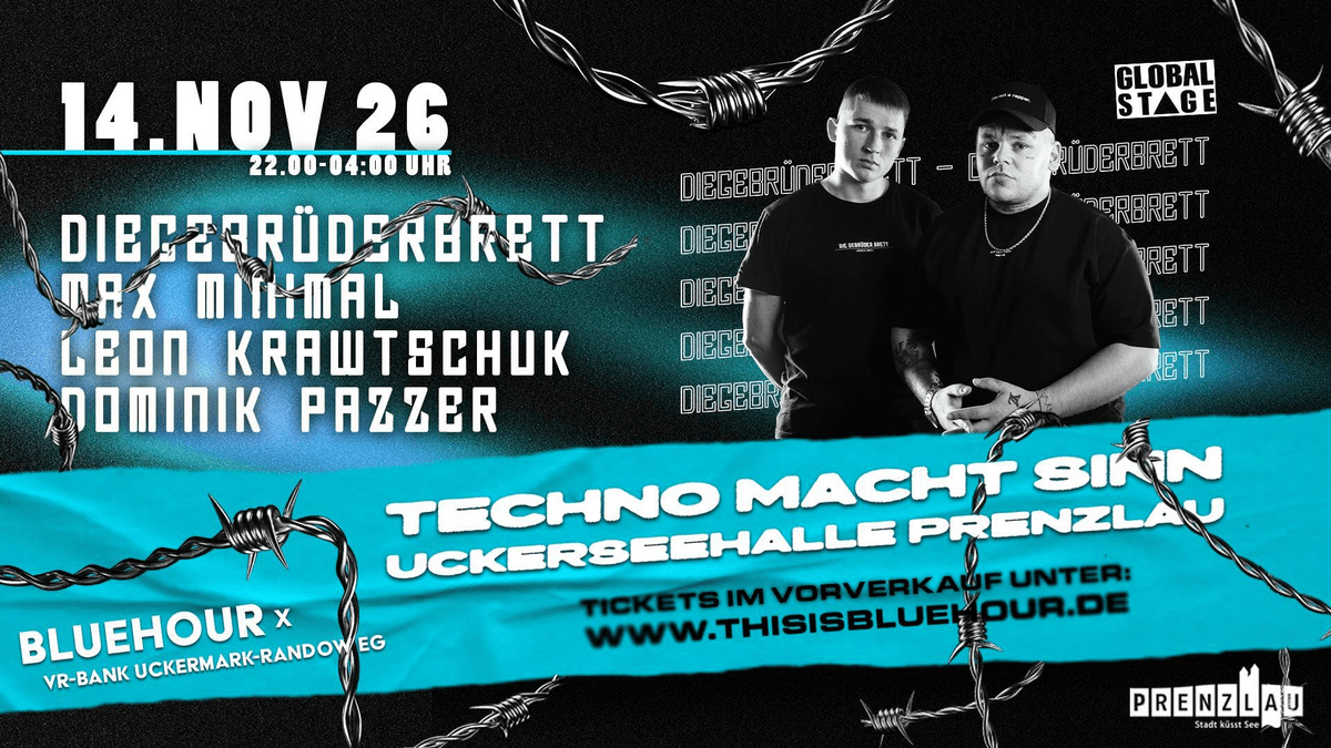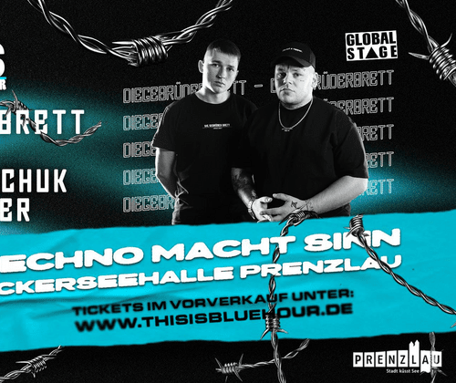 BLUEHOUR x VR-Bank Uckermark-Randow eG präsentieren DIEGEBRÜDERBRETT live, BLUEHOUR CREW DEKO MIT GRAFFITIS, EINZIGARTIGES BÜHNENBILD, TECHNO MACHT SINN  DIEGEBRÜDERBRETT /// GLOBAL STAGE ~ LEON KRAWTSCHUK /// TRIEBTON ~ MAX MINIMAL ~ DOMINIK PAZZER