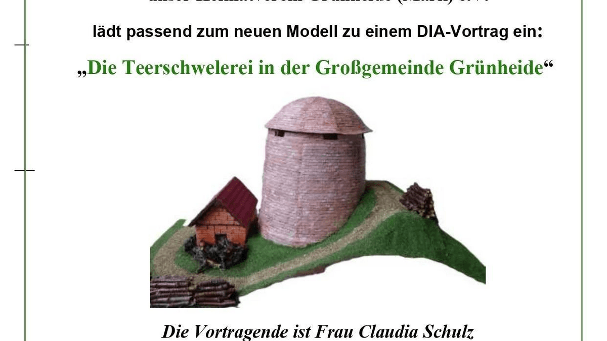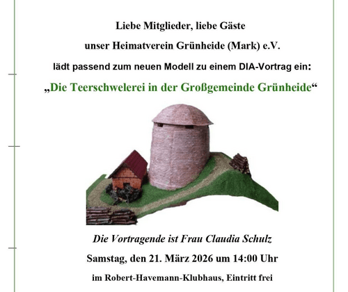 Der Heimatverein Grünheide (Mark) e.V. lädt passend zum neuen Modell herzlich zu einem DIA-Vortrag ein.  Unter dem Titel „Die Teerschwelerei in der Großgemeinde Grünheide“ nimmt Frau Claudia Schulz die Besucherinnen und Besucher mit auf eine spannende Reise in die regionale Geschichte und beleuchtet die Bedeutung der Teerschwelerei für die Entwicklung der Region.