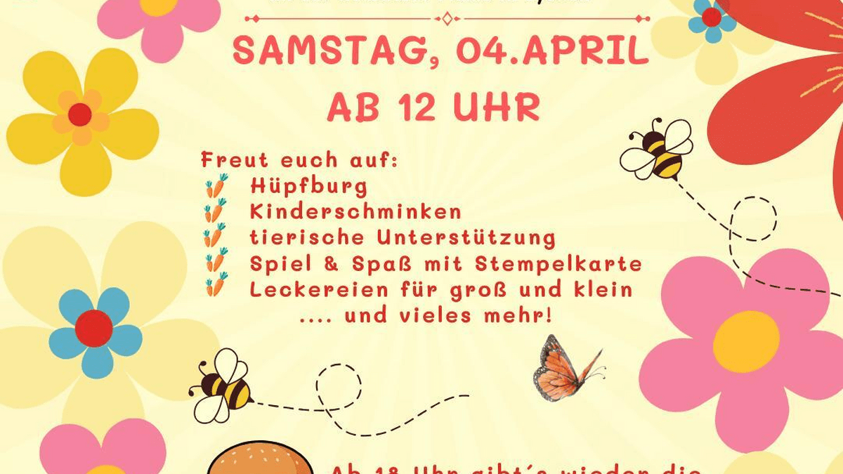 Der Frühling ist da – und das möchten wir gemeinsam mit euch feiern! Am Samstag, den 04. April, ab 12 Uhr laden wir euch herzlich zu unserem bunten Osterfest ein. Freut euch auf strahlende Kinderaugen bei der Hüpfburg, fantasievolles Kinderschminken und tierische Unterstützung zum Staunen und Entdecken. Mit unserer Stempelkarte wird gespielt, gelacht und gesammelt – und natürlich warten leckere Köstlichkeiten auf Groß und Klein. Ab 18 Uhr gibt es außerdem wieder unsere legendären KM Burger – ein Genuss, den ihr nicht verpassen solltet! Kommt vorbei, bringt eure Familie und Freunde mit und verbringt mit uns einen fröhlichen Frühlingstag voller Spaß, Genuss und guter Laune. Wir freuen uns auf euch! 🐣🌷✨