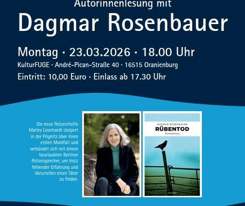 Im Rahmen der Veranstaltungsreihe LiteraturFieber begrüßt das ReMO-Regionalmuseum Oberhavel am 23.03.2026 Frau Dagmar Rosenbauer in den neuen Örtlichkeiten der KulturFUGE Oberhavel. Sie wird zusammen mit Schauspielerin Katharina Blaschke aus ihrem Debüt Kriminalroman vorlesen. Informationen zur Autorin: Nach dem Studium der Theater-, Film- und Fernsehwissenschaft, verschiedenen Stationen im WDR und als Geschäftsführerin einer Produktionsfirma arbeitet Dagmar Rosenbauer als Film- und Fernsehproduzentin. Für ihre Produktionen erhielt sie u.a. den Grimme-Preis, den Deutschen Fernsehpreis, den Deutschen Wirtschaftsfilmpreis und den Deutschen Entertainmentpreis. Mit ihrem Mann und ihrem Hund lebt sie in der Prignitz und Berlin. Klappentext zum Buch: Ein erfrischend unterhaltsamer Kriminalroman mit Tiefgang und viel Liebe für Land und Leute. Marley Leonhardt, neue Polizeichefin in Neuruppin und von den männlichen Kollegen als Quotenfrau belächelt, benötigt dringend einen Erfolg. Die Leiche in einer Prignitzer Rübenmiete scheint die perfekte Gelegenheit zu sein, ihr Können unter Beweis zu stellen. Dumm nur, dass Marley jegliche praktische Erfahrung fehlt. Aber da gibt es ja Richard Said Wagner, den sie zufällig am Fundort trifft. Der prominente Berliner Polizeisprecher ist seit Monaten beurlaubt und lebt zurückgezogen. Können die beiden ihre Kräfte bündeln und den Mordfall lösen? „Rübentod“ heißt ihr Erstlingswerk, es ist ein Krimi und erschien im Emons-Verlag. Der Krimi spielt zudem in der Prignitz, einer der Handlungsorte ist dabei Gumtow.