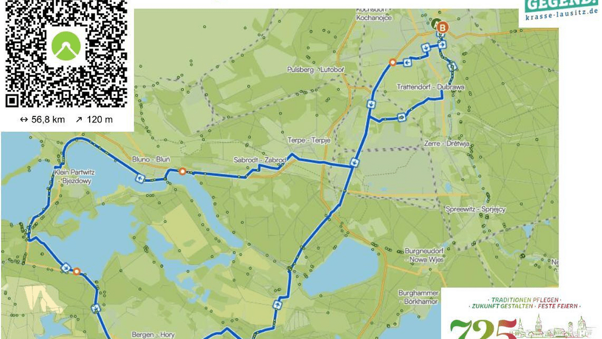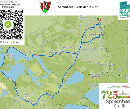 Rauf aufs Rad und gemeinsam die wunderschöne Lausitz entdecken! Start ist auf dem Marktplatz in Spremberg. Von dort führt die rund 56,8 km lange Tour mit etwa 120 Höhenmetern durch die idyllische Umgebung rund um Spremberg, die Perle der Lausitz. Die geführte Tour kann ganz einfach über die Komoot-App begleitet werden. Also anmelden, mitradeln und die Region neu erleben! Jetzt QR-Code scannen, anmelden und dabei sein!