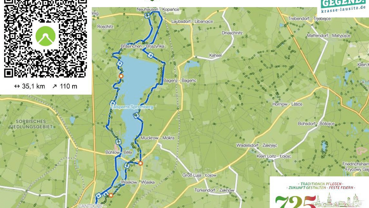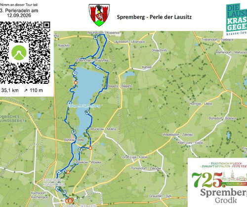 Rauf aufs Rad und gemeinsam die wunderschöne Lausitz entdecken! Start ist auf dem Marktplatz in Spremberg. Von dort führt die rund 35,1 km lange Tour mit etwa 110 Höhenmetern durch die idyllische Umgebung rund um Spremberg, die Perle der Lausitz. Die geführte Tour kann ganz einfach über die Komoot-App begleitet werden. Also anmelden, mitradeln und die Region neu erleben! Jetzt QR-Code scannen, anmelden und dabei sein!