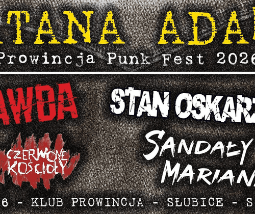 Katana Adama – Prowincja Punk Fest 2026 steht vor der Tür! Jedes Jahr gedenken wir mit einem Konzert unserem Freund und Stammgast, der uns (viel zu früh) verlassen hat... Aber die Erinnerung an ihn und seine charakteristische Jeans-Jacke ("katana"), übersät mit Aufnähern seiner Lieblingsbands, wird uns für immer begleiten! In diesem Jahr treten folgende Bands auf: Prawda (Breslau), Stan Oskarżenia (Breslau), Czerwone Kościoły (Złotów) und Sandały Mariana (Breslau).